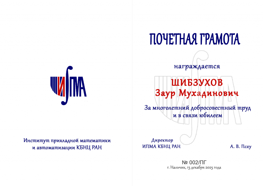 Псху Арсен Владимирович, заведующий отделом нейроинформатики и машинного обучения, к.ф.-м.н. Лютикова Лариса Адольфовна и заведующий отделом уравнений смешанного типа, к.ф.-м.н. Аттаев Анатолий Хусеевич. Кроме того, директор института Псху А.В. вручил ему Почетную грамоту ИПМА.
